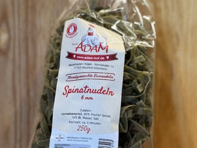 Sie greifen hier zu handwerklich hergestellten Eiernudeln mit frischem Spinat. Die Nudeln bringen eine leichte grüne Farbe und einen milden Spinatgeschmack auf den Teller. Die Struktur bleibt beim Kochen stabil und eignet sich für schnelle Gerichte.
