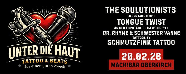 Ein Abend, der unter die Haut geht – im wahrsten Sinne des Wortes. Lasst euch von Schmutzfink Tattoo (Offenburg) ein kleines Kunstwerk stechen (Erlös wird gespendet) und feiert danach zu fetten Beats. Das musikalische Line-Up ist stark: Soul & Funk von The Soulutionists, HipHop von Tongue Twist, Doktor Rhyme& Schwester Vanne sowie DJ Wildstyle an den Turntables.